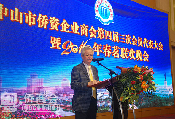 会长古润金致辞说,2015年,中山侨商会紧紧围绕中山经济社会发展大局,在市委市政府的关怀下,在市外事侨务局的指导下,在各级部门的支持下,在理事会和会员们的努力推动下,秉承办会宗旨,坚持创新发展,切实发挥“侨商之家”作用,提高服务侨商水平,引导会员企业加快转型升级,增强了侨商会的影响力和凝聚力,为建设幸福和美中山作出了积极贡献。他说,这一年,我会积极为会员企业转型升级提供智力服务,为会员企业投资发展提供融资服务,为会员企业有效管理提供咨询服务,为会员企业联络外界提供交流服务,为会员企业合法利益提供维权服务,推动侨资企业适应新常态发展。这一年,中山侨商会增强服务经济社会的效果,在2015年中山慈善万人行活动中,会员共计捐款达700多万元,其他公益慈善捐款超过6000万元。
