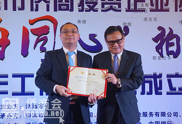 黄柱焕代表广东省侨商会致辞,他表示,希望清远市侨商会积极响应国家“一带一路”战略,参与省、市的重大规划和部署,积极发挥侨商会的平台作用,做好引领侨资企业创新发展和转型升级工作,不断提升为侨资企业服务的水平,使侨商在发展中不断壮大。