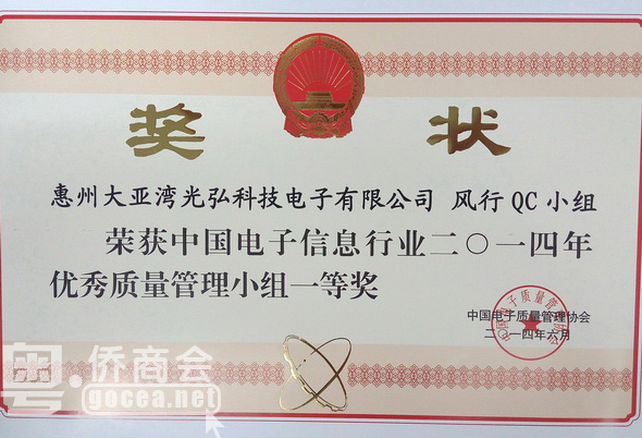 2014年7月,广东省侨商会副会长单位、惠州大亚湾光弘科技电子有限公司3个QCC改善成果参加"中国电子质量管理协会"在河北石家庄举办的QCC成果发表会。本次大会共有80多家知名企业的200多个改善课题参与发表,例如:海尔、TCL、爱普生、中国移动、中国电子科技等行业巨头。经过激烈的角逐,光弘的3个改善成果表现优异,均荣获“一等奖”,他们分别是: