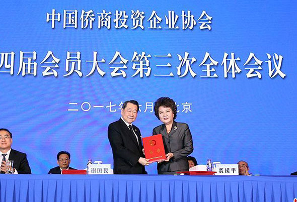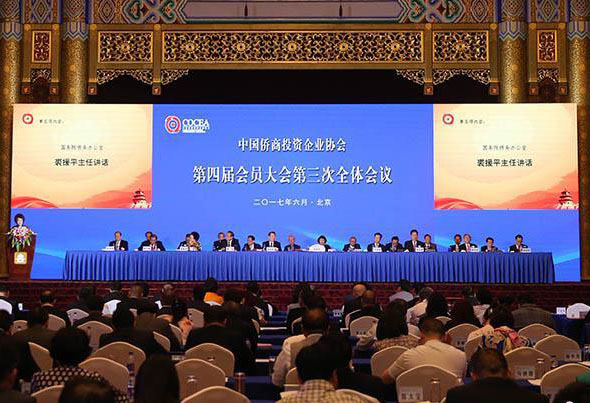 中国侨商投资企业协会第四届会员大会6月11日在北京召开,国侨办主任裘援平、中国侨商会会长谢国民出席会议并发表讲话。国侨办副主任郭军及来自各地的会员代表约350人出席会议。