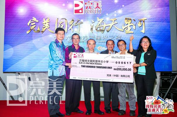 当晚,以“完美同行,海天星河”为主题的2017完美沙巴星光之夜在LIKAS湾基金大厦举办,胡瑞连代表完美公司向兰瑙培文国民型华文小学移交20万令吉捐赠支票。