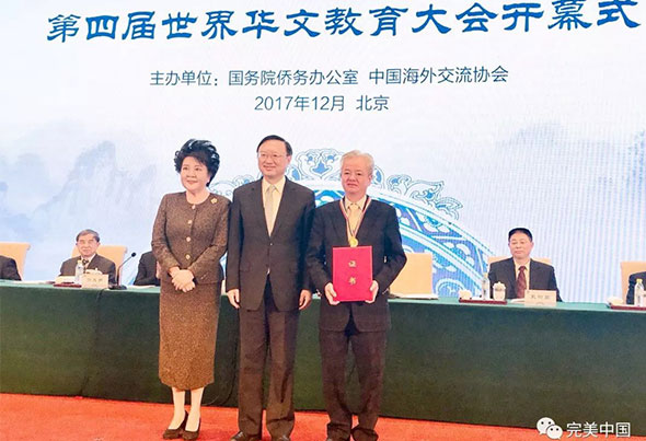 12月19日,由国务院侨务办公室和中国海外交流协会主办的第四届世界华文教育大会在北京开幕,近600位华文教育界代表齐聚一堂。广东省侨商投资企业协会会长、完美(中国)有限公司董事长古润金因长期以来为促进海外华文教育事业发展所作的贡献,被国侨办和中国海交会授予“热心海外华教人士杰出贡献奖”,并接受中共中央政治局委员、国务委员杨洁篪颁授奖牌和证书。