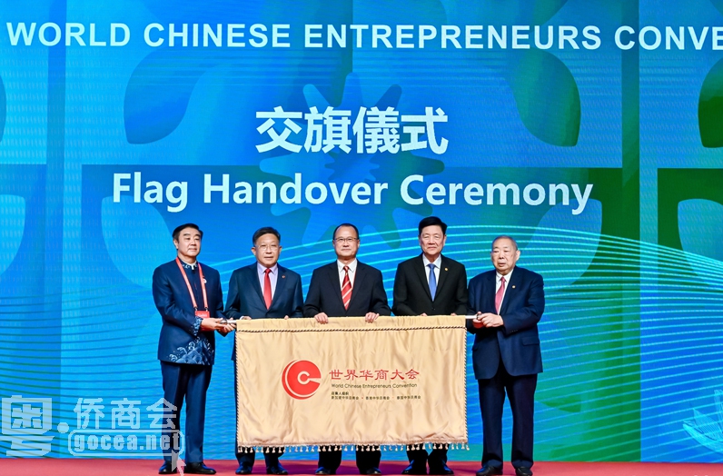 在4日晚上的闭幕式上,世界华商大会召集人组织宣布阿联酋中华工商总会将举办下一届世界华商大会。泰国中华总商会主席林楚钦表示,从第19届开始,恢复两年举办一届。他与崔世昌、蔡冠深、新加坡中华总商会会长高泉庆及阿联酋中华工商总会会长唐振刚一道,在现场进行世界华商大会会旗交接仪式。