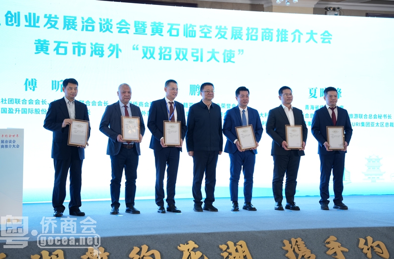 会上,罗爱武、傅昕、林鹏等6位侨领侨商被聘为黄石海外“双招双引大使”,助力黄石对接全球产业、资本、人才,拓宽招商引资渠道。学海行舟公益基金会进行捐赠,黄石港区作临空招商推介。