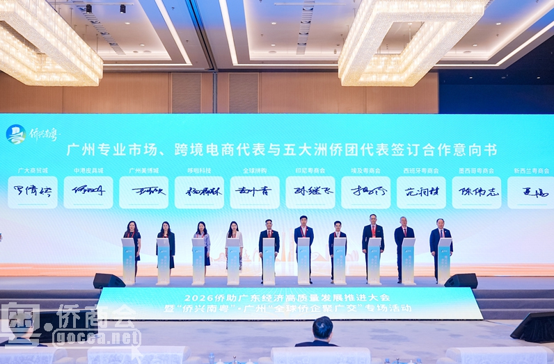 大会现场举行了2026“侨助广东经济高质量发展”十大重点项目签约仪式。此外,广州专业市场负责人与相关侨团代表签订合作意向书,广州跨境电商与海外侨团代表签订共建共享海外仓意向书。